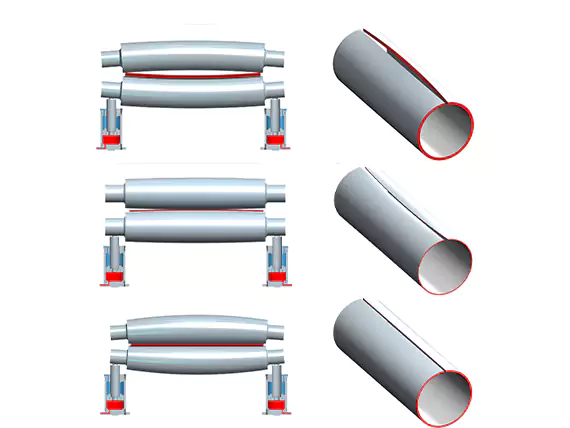 Pendant le processus de flexion, La pression exercée sur les rouleaux peut provoquer une légère déviation au centre, ce qui entraîne une courbure inégale ou des zones plates le long de la plaque. Pour éliminer cela, Nos machines sont équipées d’un Système de compensation de couronnement conçu de précision.