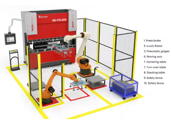 Une cellule de flexion moderne est conçue pour être efficace, Opérations automatisées de pliage de tôle. Sa disposition est optimisée pour assurer un écoulement fluide des matériaux, précision, et sécurité de l’opérateur. Les principaux composants incluent généralement: